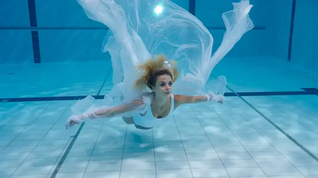 A female dancer performs underwater in a large pool. Flowing white fabric moves around her in slow, unpredictable ways. Camera circles at medium distance using a smooth underwater dolly rig. She rises slowly from the pool floor toward the surface, arms extended. Light filters down from above in shifting columns. She reaches the surface, camera breaks the water line with her, spray catching light.