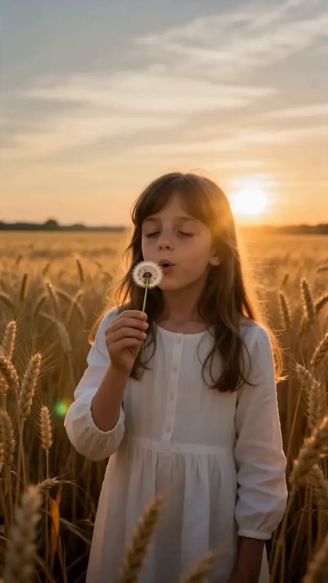 [0-5s] A young girl blows dandelion seeds into the wind in a golden wheat field at sunset. Each seed catches the light like a tiny star. [5-10s] The camera follows a single seed as it drifts upward into the sky, the girl shrinking below. The seed travels through pink clouds. [10-15s] The seed descends into a different landscape — a misty Japanese garden — and lands gently on a stone lantern covered in moss. Full circle. A meditation on journeys and arrivals.