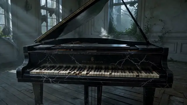 A time-lapse of a grand piano slowly decaying in an abandoned ballroom over decades. The lacquer cracks, keys yellow and curl, strings snap sending dust into shafts of light. Vines creep through broken windows and wrap around the legs. A single key presses down by itself and plays one last note that echoes through the empty space. Camera slowly orbits throughout. Melancholic, poetic.