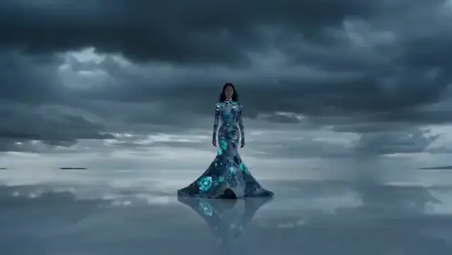 [Style] Hollywood Haute Couture Fantasy blockbuster, 8K ultra-clear, Photorealistic, High-fashion Editorial Style, Unreal Engine 5 fluid rendering. [Duration] 15 seconds. [Scene] An endless Salar de Uyuni salt flat. [00:00-00:05] Shot 1: An Asian female model walks coolly on the water surface wearing a long dress made of flowing Liquid Blue-and-White Porcelain. The skirt makes crisp collision sounds, with blue-and-white patterns moving across the surface. [00:05-00:10] Shot 2: The model stops, stares at camera, snaps her fingers. The porcelain dress explodes into thousands of photorealistic Ink-wash Swallows carrying water droplets and ink marks, spinning around her. [00:10-00:15] Shot 3: The swallows plunge into the mirrored lake. The world begins to bleed and dissolve like ink in water. Everything transforms into a grand 3D Fluid Ink Vortex, swallowing the camera into a black and white abyss.