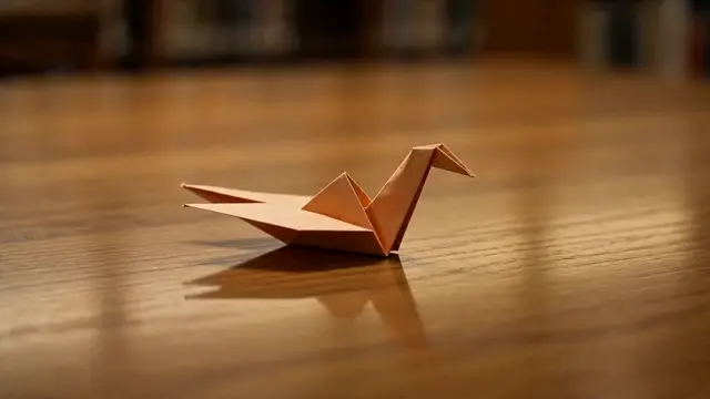 Close-up of a folded paper crane on a wooden desk. The paper begins to ripple, edges curl, and the crane slowly transforms into a real living butterfly which takes flight out of frame. Warm library lighting, shallow focus, whimsical wonder, realistic macro textures transitioning to organic life.