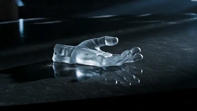 An ice sculpture of a hand slowly melts on a dark stone surface. As the water pools, it ignites into a controlled blue flame that reshapes into the same hand silhouette standing upright. Dramatic side lighting, temperature contrast, surreal fluid continuity. Physics-defying studio visual.