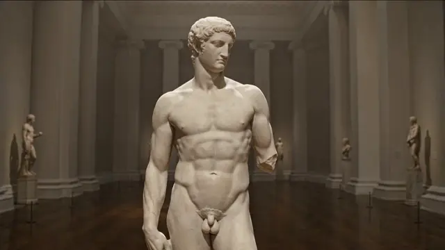 A classical marble statue in a museum gallery slowly cracks. Fragments of stone flake off to reveal the living figure beneath, who takes a first breath and turns to look at the camera. Soft museum lighting, dust motes, mythic realism, subtle shift from cold marble to warm skin tones.