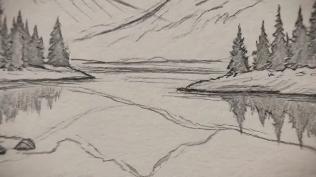 A pencil sketch of a landscape on white paper. The sketch lines begin to fill with color, then gradient, then photo-realistic detail, finally camera pushes through into the fully rendered landscape itself as a 3D scene. Seamless transition from flat drawing to immersive environment.