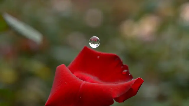Extreme macro shot of a single raindrop landing on a red rose petal in slow motion. The impact creates a perfect crown splash, sending micro-droplets into the air. Each tiny droplet refracts the garden behind it. The camera holds perfectly still as the splash settles and the petal gently bobs. Shallow depth of field, backlit by diffused morning light.