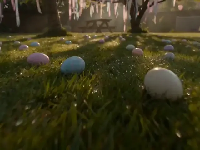 FORMAT: 15s / single continuous impossible camera move / no dialogue STYLE: Early morning Easter atmosphere, soft golden sunrise, dew-covered grass, pastel tones, natural light bloom, photorealistic ground-to-aerial cinematic 8K Shot 01 (0:00–2:00): Camera begins