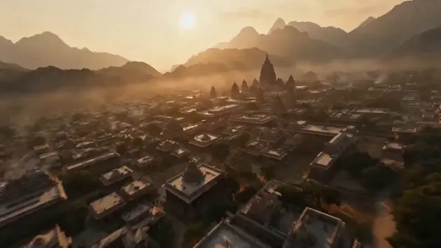 extremely fast-paced cinematic FPV flying through the ancient Gandhara kingdom at its peak, hyper-realistic, 4K detail, golden-hour lighting, soaring over grand Buddhist stupas, Greco-Indian architecture, bustling ancient marketplaces, monks in saffron robes, intricate stone carvings, silk road traders, dramatic mountain backdrops, epic scale, immersive depth, volumetric lighting, atmospheric haze, film-grade color grading, ultra smooth stabilization, intense pacing, cinematic sound design