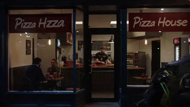 Single continuous cinematic shot, no music. From outside the glass window, the dim camera slowly pushes inward into a pizza shop. A bearded white male employee is baking pizza. He removes the pizza from the oven with a metal tray, places it into a red takeaway box, closes the lid, and then hands it to a customer with a warm smile.