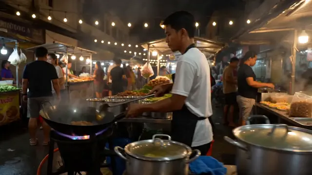 Handheld camera weaves through a crowded Southeast Asian night market. Golden light from hanging bulbs reflects off wet pavement. Tight tracking shots move between stalls: a wok erupts in a column of flame, skewers char on an open grill, a vendors hands fold a banana leaf around sticky rice with practiced speed. Medium shot: a young couple shares a bowl of noodles at a plastic table, steam rising between them.