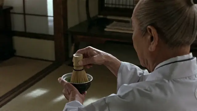 A Japanese tea master performs a traditional tea ceremony in a dimly lit tatami room. Close-up of aged hands whisking matcha with precise, deliberate motions. Steam rises from the bowl catching soft window light. The camera slowly pushes in as he lifts the bowl with both hands, offering it forward. Wabi-sabi aesthetic, 16mm film grain, contemplative silence.