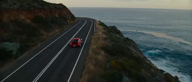 Aerial drone shot following a lone vintage red Porsche 911 racing along a winding coastal highway at golden hour. The camera sweeps from directly above, gradually pulling back to reveal dramatic sea cliffs and crashing waves below. Lens flare from the setting sun, cinematic color grade with warm amber highlights and cool ocean blues. The car engine roar fades into the sound of wind and waves.